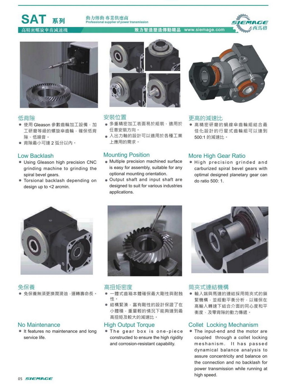●齒轮采用高強力滲碳合金鋼,研磨精密度符合AGMA12 級標準以内。